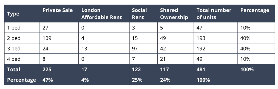 In April 2025, Wates applied for planning permission for 481 new homes with the following tenure mix: