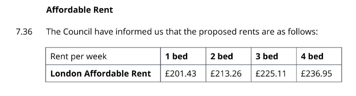 The planning application documents state that the rents for the London Affordable Rent homes will be set as follows: